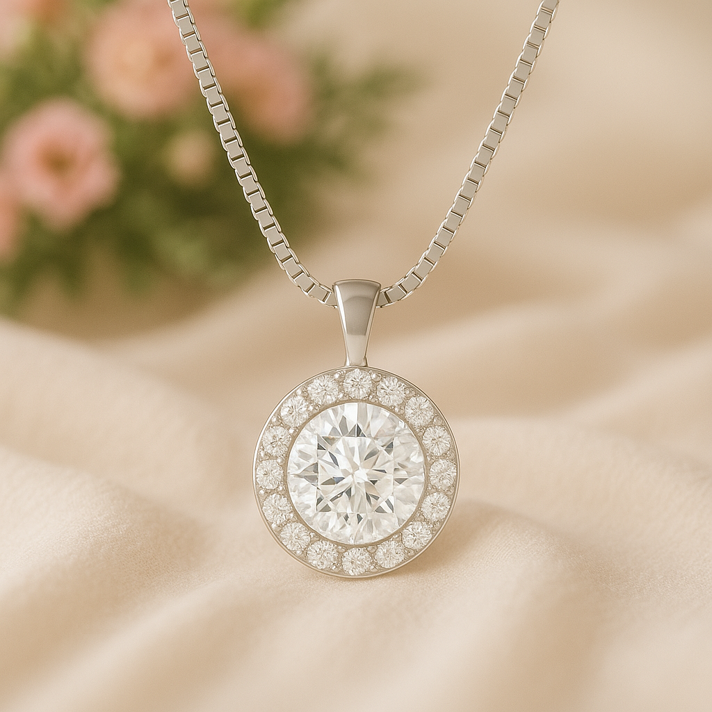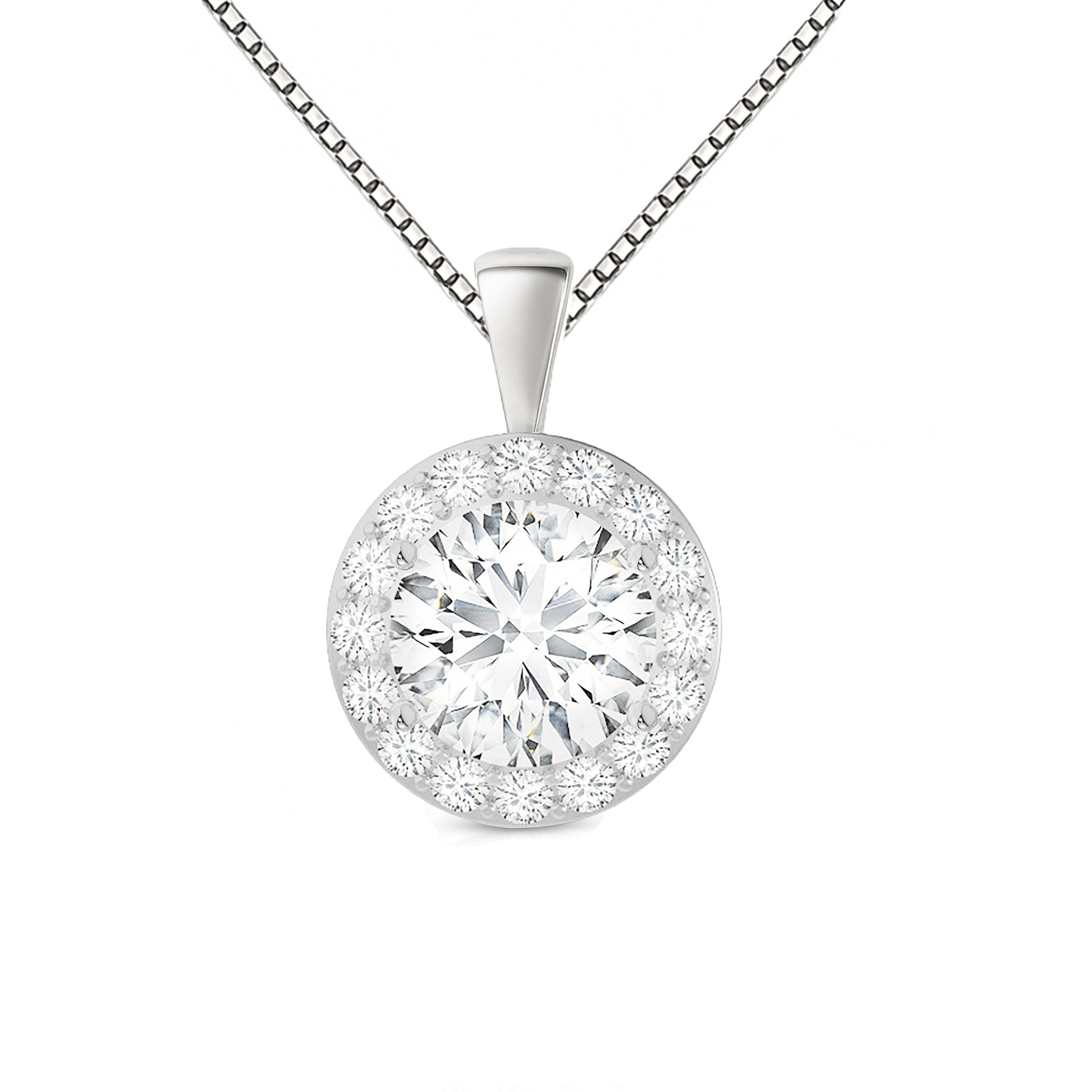 Add timeless sparkle to your jewelry collection with our Round Cut Moissanite Halo Pendant Necklace, expertly crafted in solid 14K white gold. A radiant round-cut moissanite takes center stage, beautifully surrounded by brilliant accent stones in a classic halo setting.
