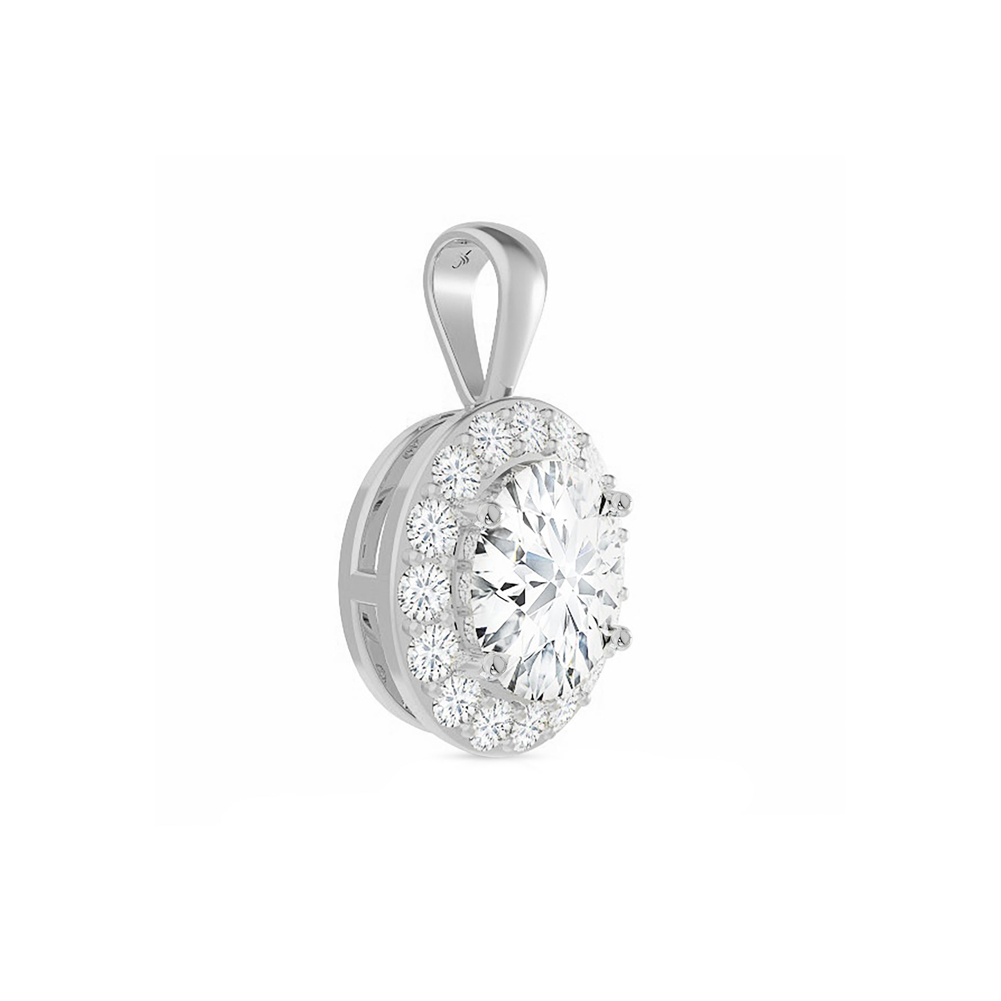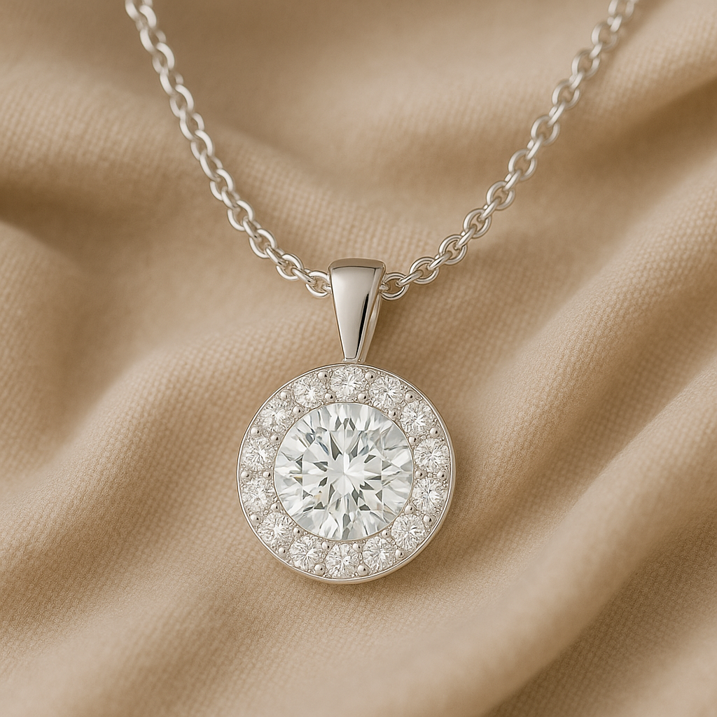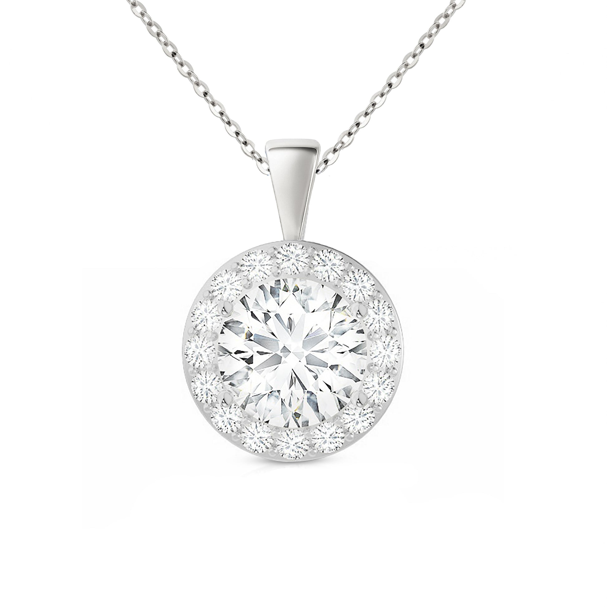 Add timeless sparkle to your jewelry collection with our Round Cut Moissanite Halo Pendant Necklace, expertly crafted in solid 14K white gold. A radiant round-cut moissanite takes center stage, beautifully surrounded by brilliant accent stones in a classic halo setting.