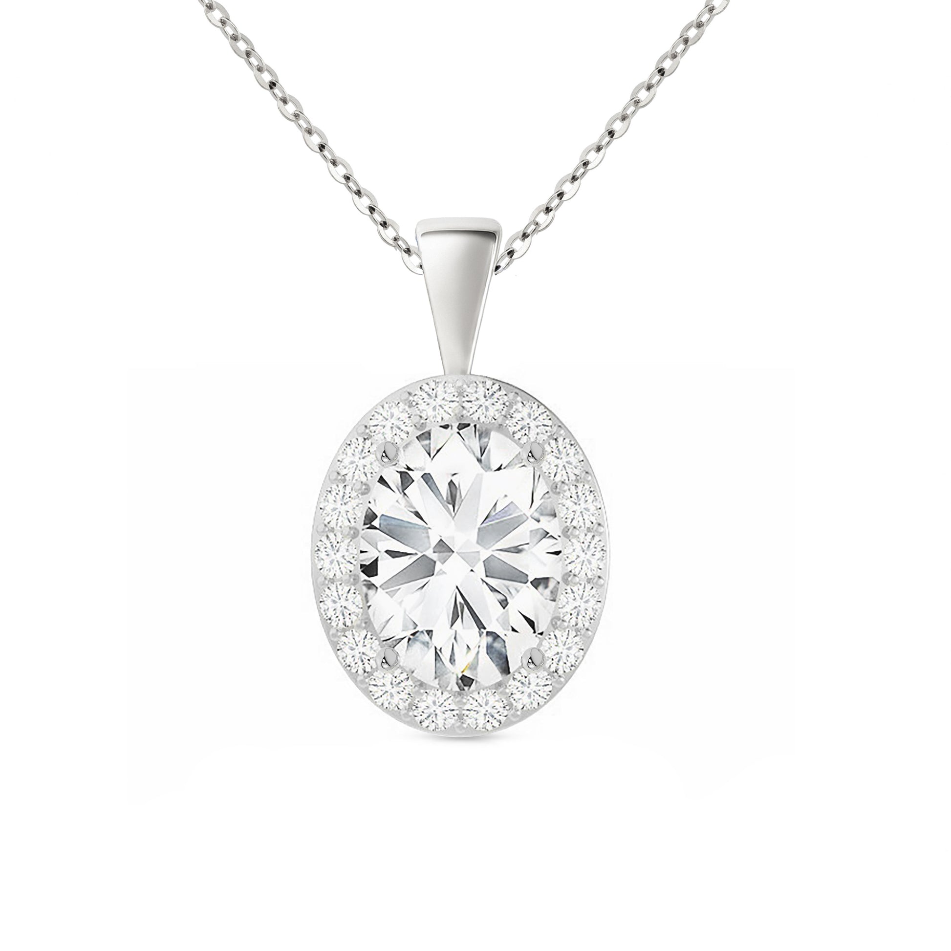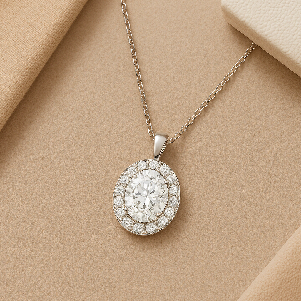 The Oval Moissanite Halo Pendant Necklace brings together classic elegance and modern versatility. Crafted from solid 14K white gold, it features a luminous oval-cut moissanite center stone, gracefully surrounded by shimmering accent stones in a refined halo setting.