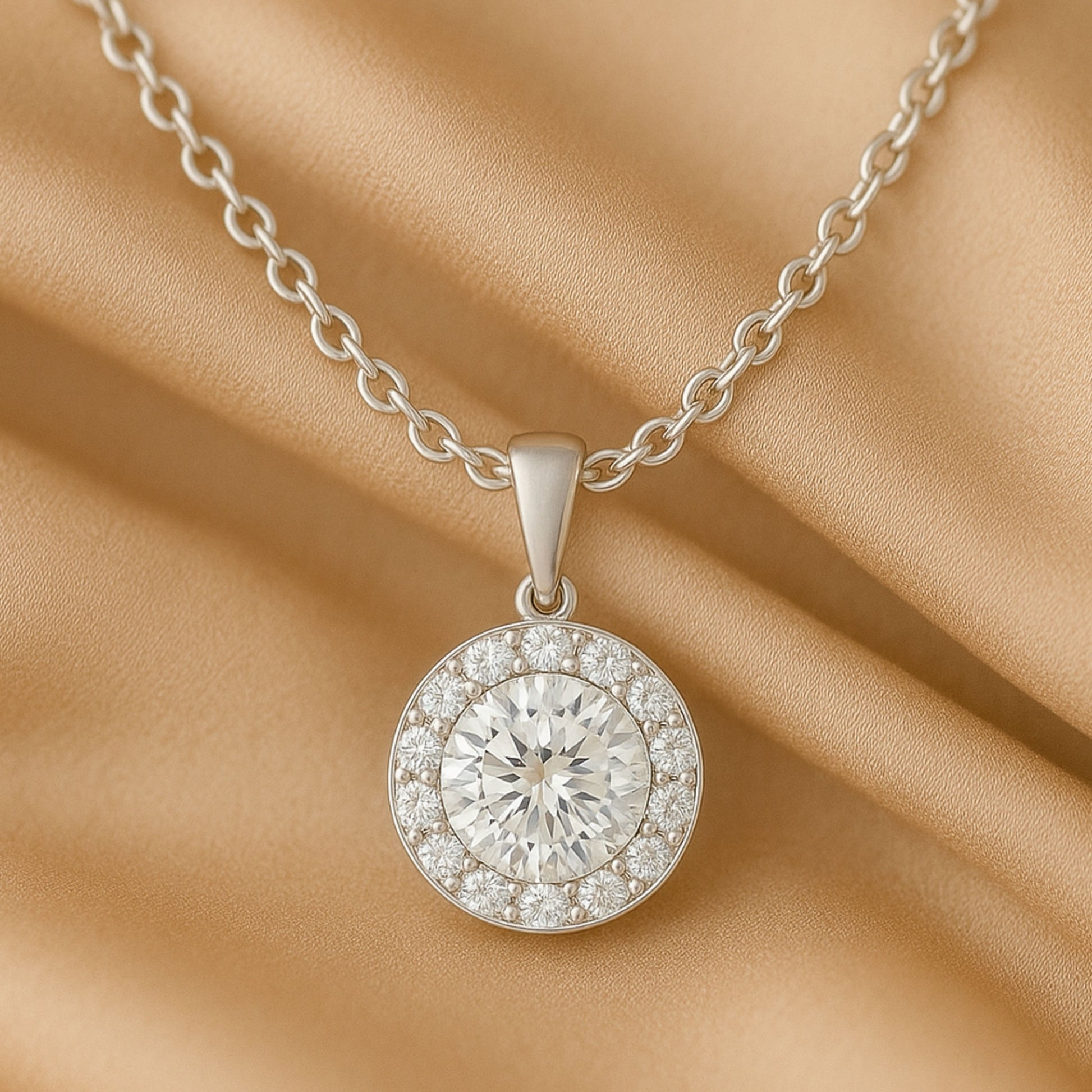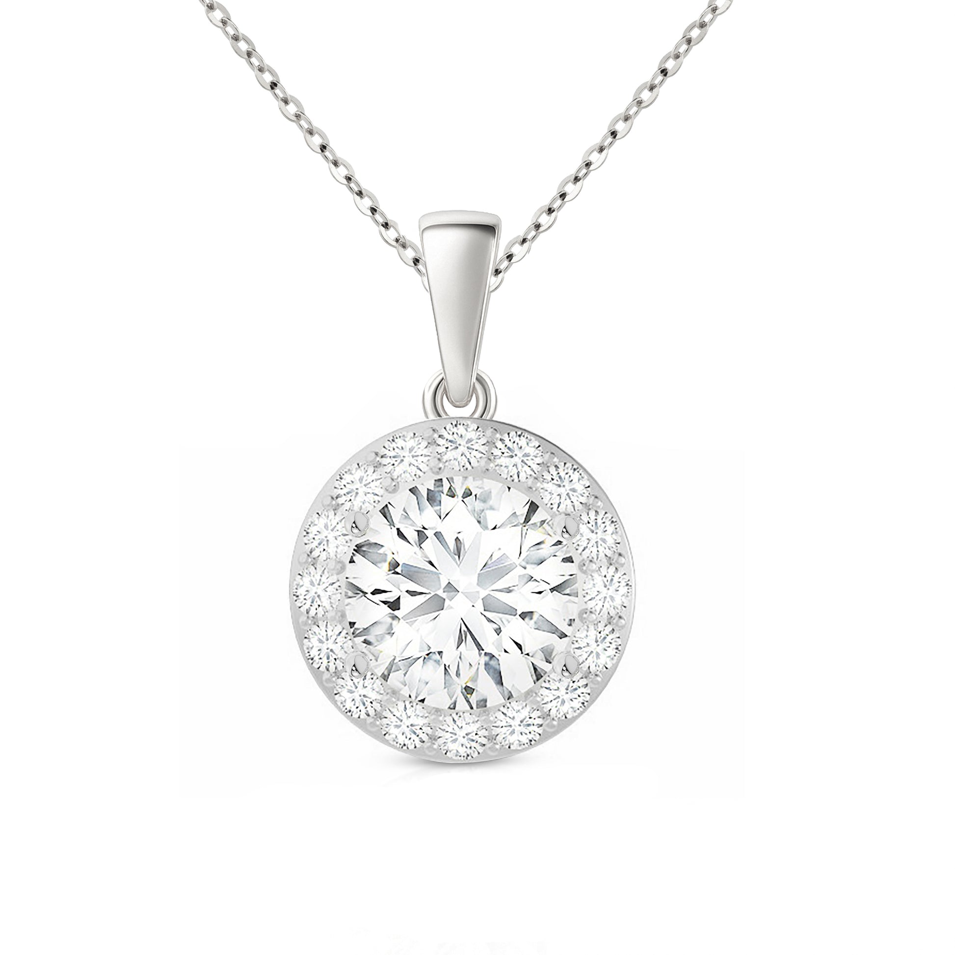 Add a touch of refined sparkle to your collection with this Round Cut Moissanite Halo Pendant Necklace, crafted in solid 14K white gold. A brilliant round moissanite center stone is framed by delicate accent stones in a classic halo setting, offering dazzling brilliance from every angle.