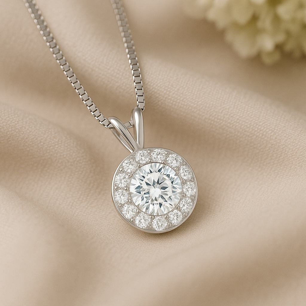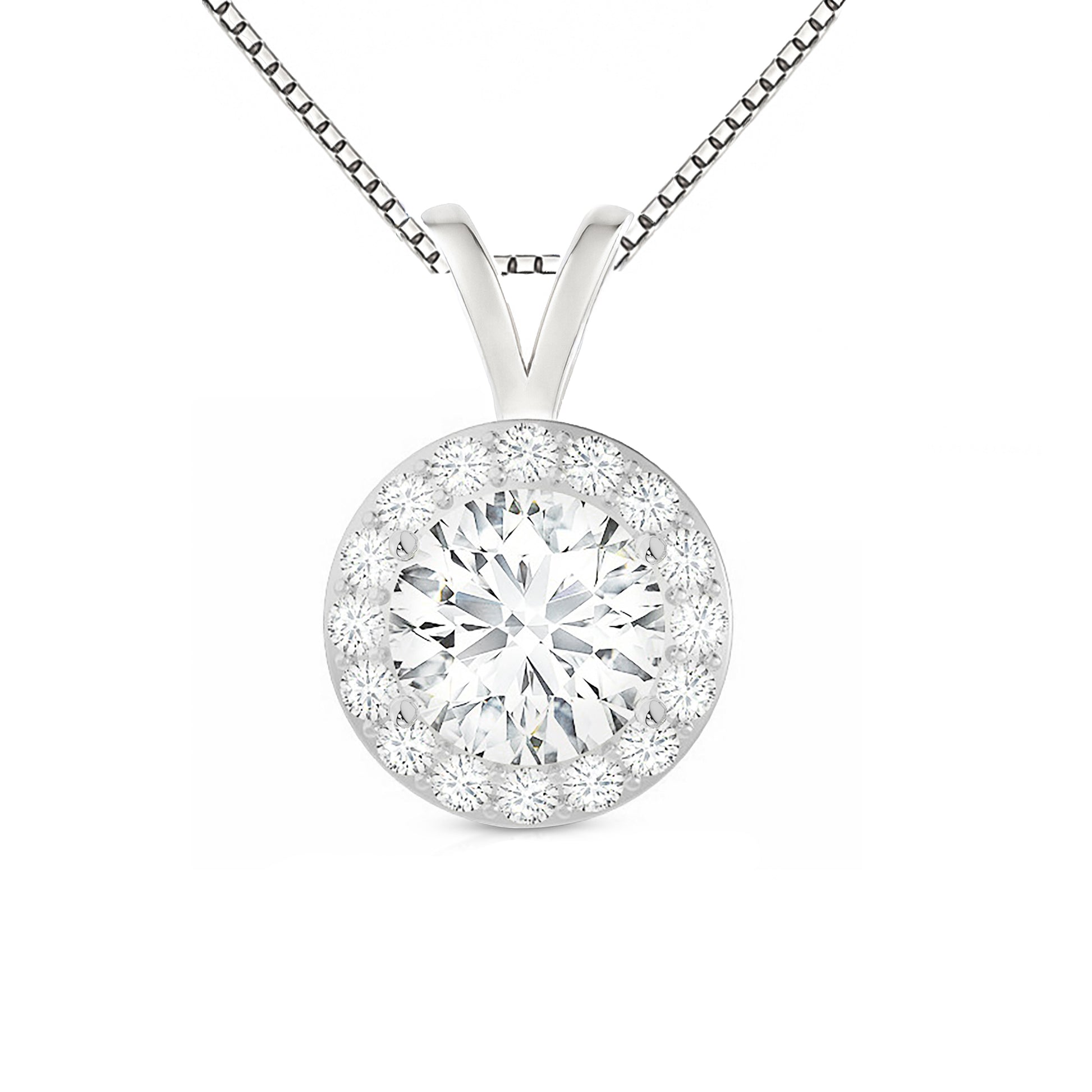 Refine your jewelry collection with our Round Cut Moissanite Halo Pendant, a striking blend of timeless sophistication and modern design. Handcrafted in solid 14K white gold, this pendant features a radiant round moissanite center, encircled by delicate accent stones for an added touch of brilliance.