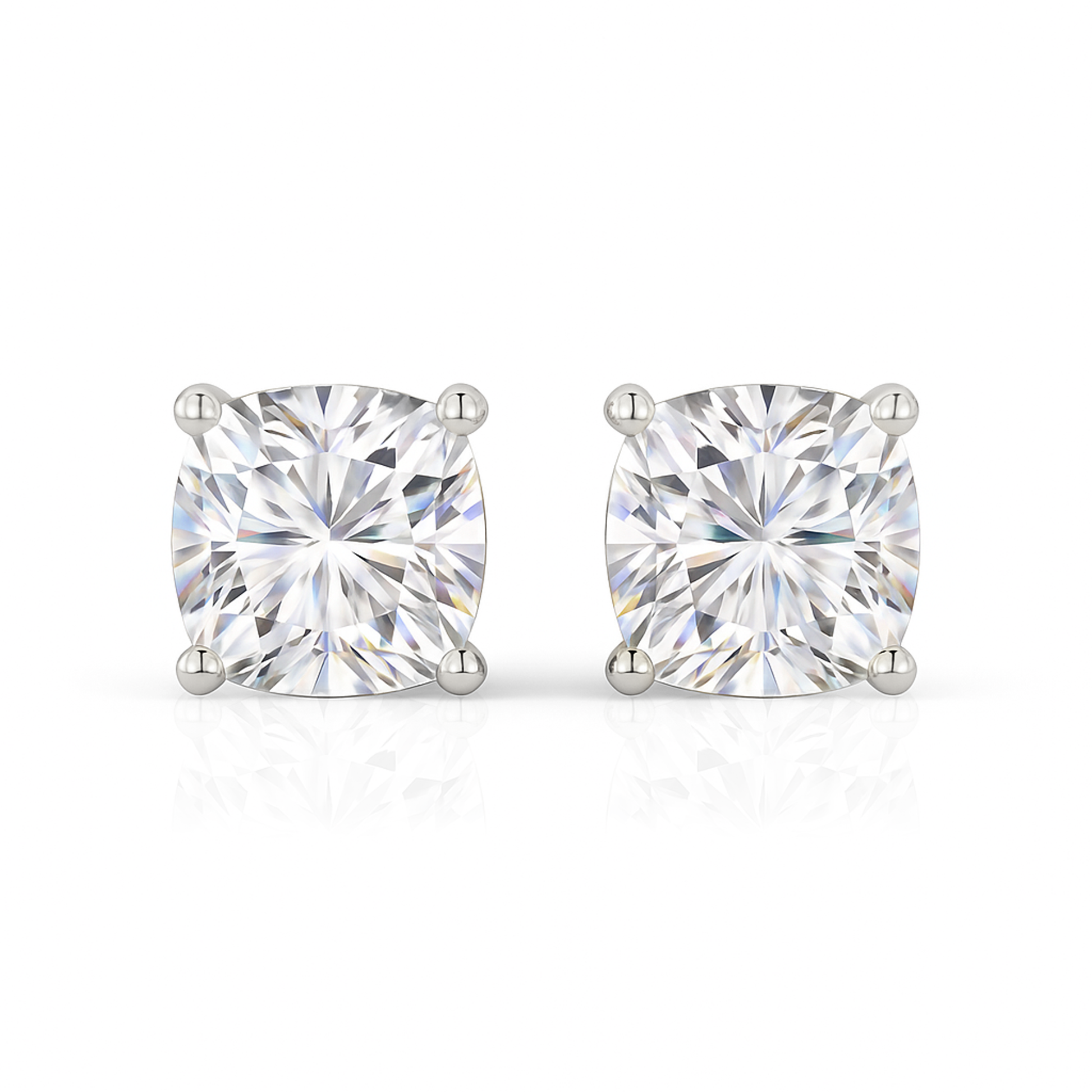Designed with softly rounded corners, the cushion-cut shape offers a modern twist on the traditional princess cut, delivering the same brilliance with a more romantic silhouette. Set in a secure four-prong solitaire setting, each stone captures and reflects light beautifully, offering exceptional sparkle from every angle.