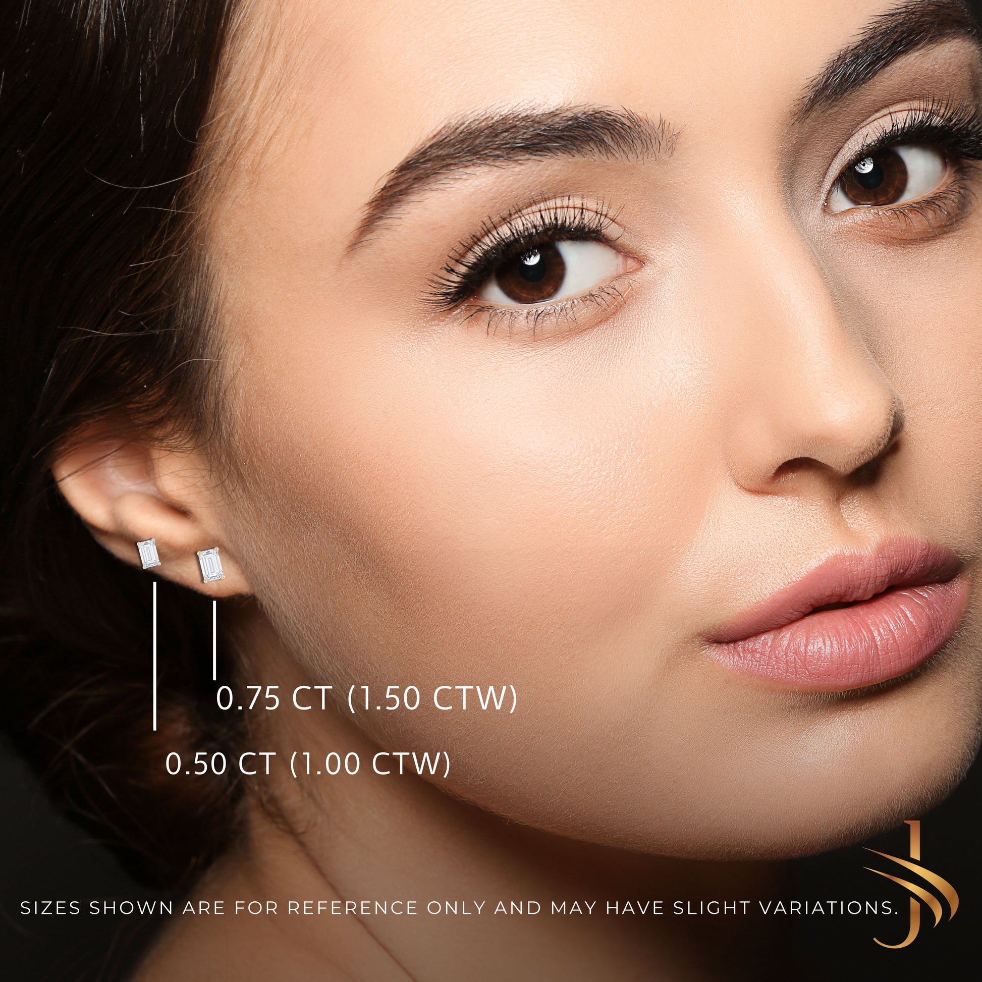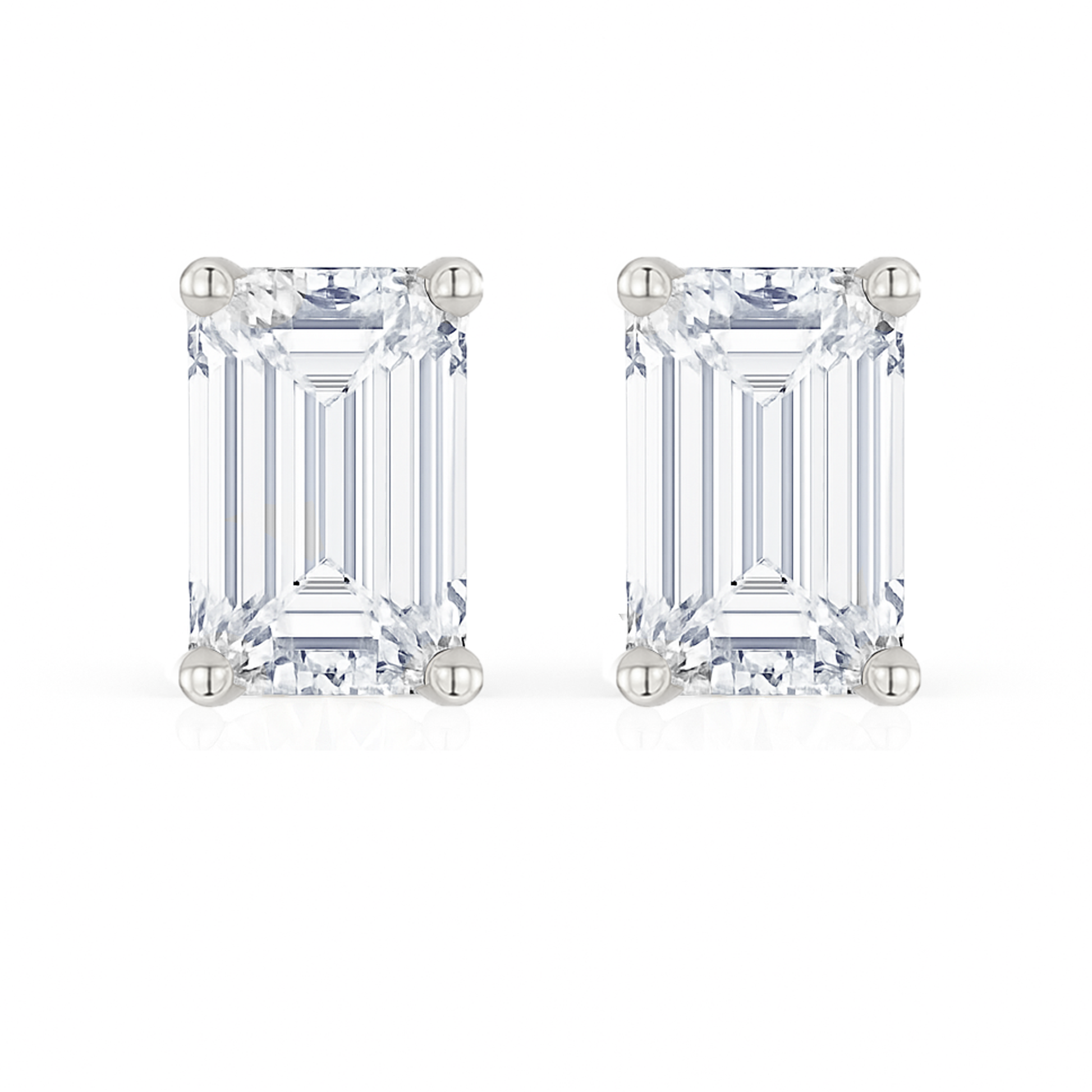 The emerald cut’s elongated shape and step-cut facets create a graceful silhouette, highlighting each stone’s clarity and delivering a striking, hall-of-mirrors effect. Set in a secure four-prong solitaire setting, these studs balance understated elegance with modern refinement.