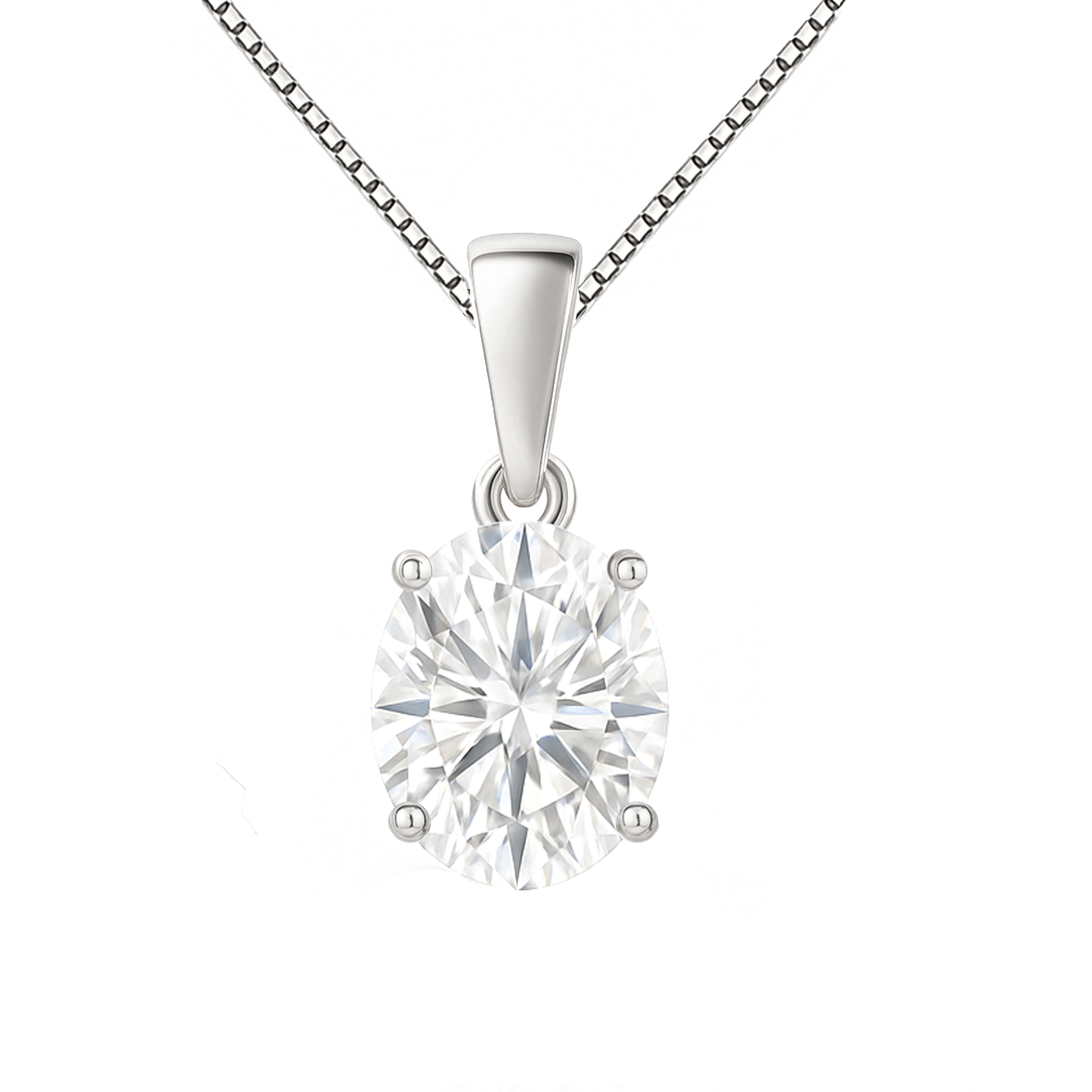 Our Oval Cut Moissanite Solitaire Pendant Necklace is a timeless expression of elegance and light. Crafted in your choice of solid 14K white or yellow gold, it features a dazzling oval-cut Moissanite in a classic 4-prong setting, precision-cut to reflect light with brilliance.