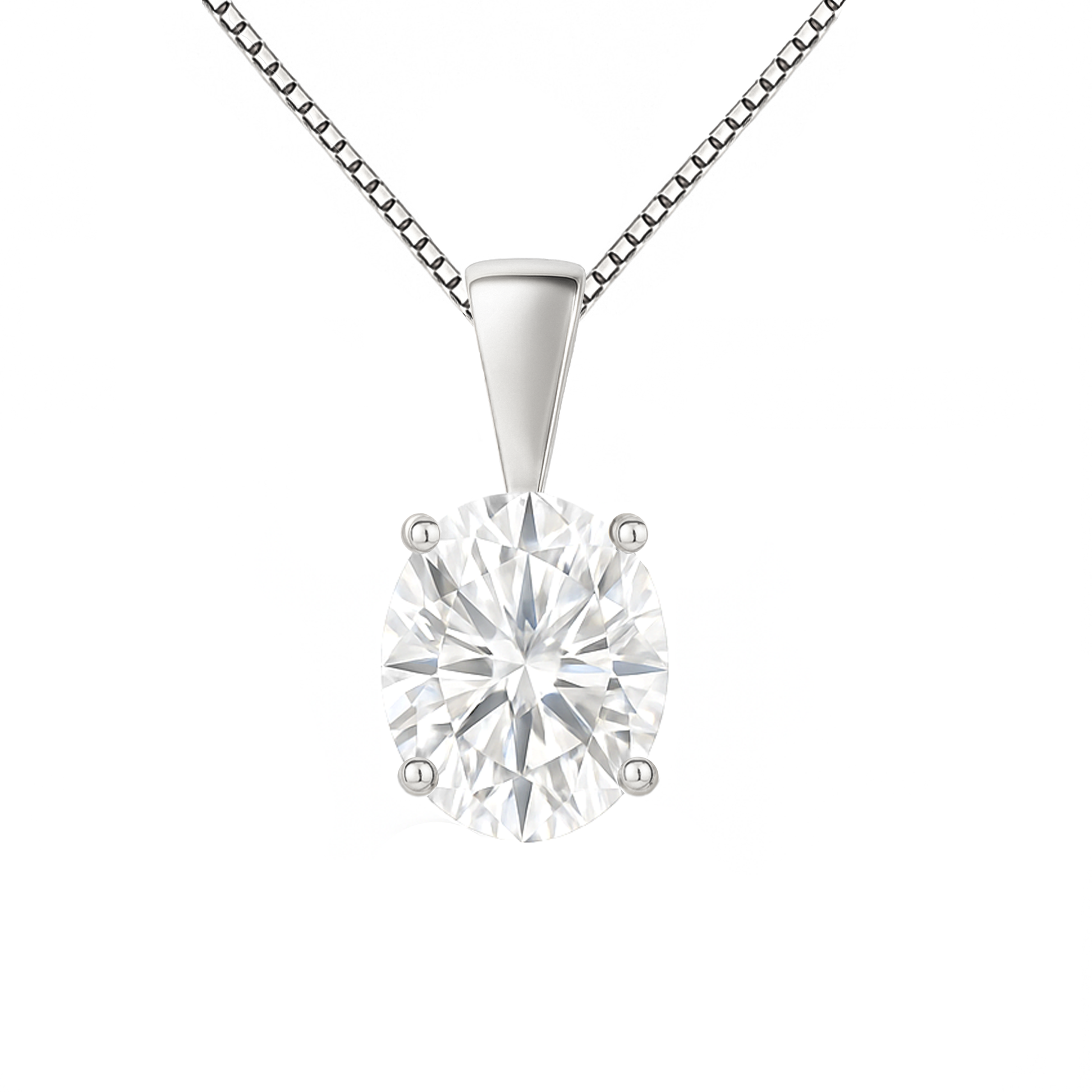 Elevate your everyday with the Oval Cut Moissanite Solitaire Pendant, a sophisticated piece that blends classic sparkle with contemporary styling. Crafted in your choice of solid 14K white or yellow gold, the radiant oval-cut Moissanite is secured in a graceful 4-prong setting, designed to enhance brilliance and depth.