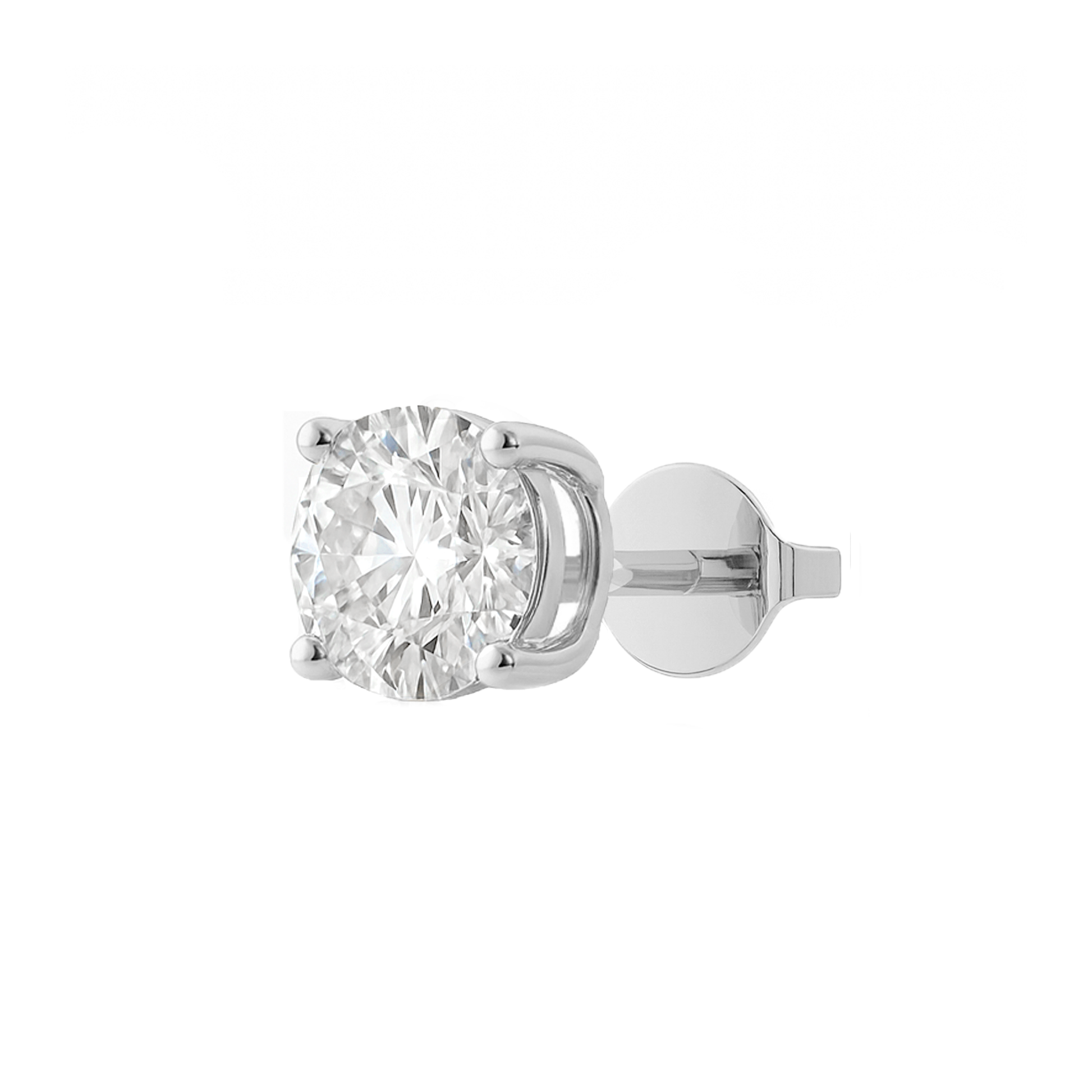 Showcasing a brilliant round-cut Moissanite — prized for its fire, clarity, and radiance — this earring is set in a classic four-prong solitaire design. Timeless yet versatile, the single stud is perfect for mixing, matching, or making a subtle statement on its own.